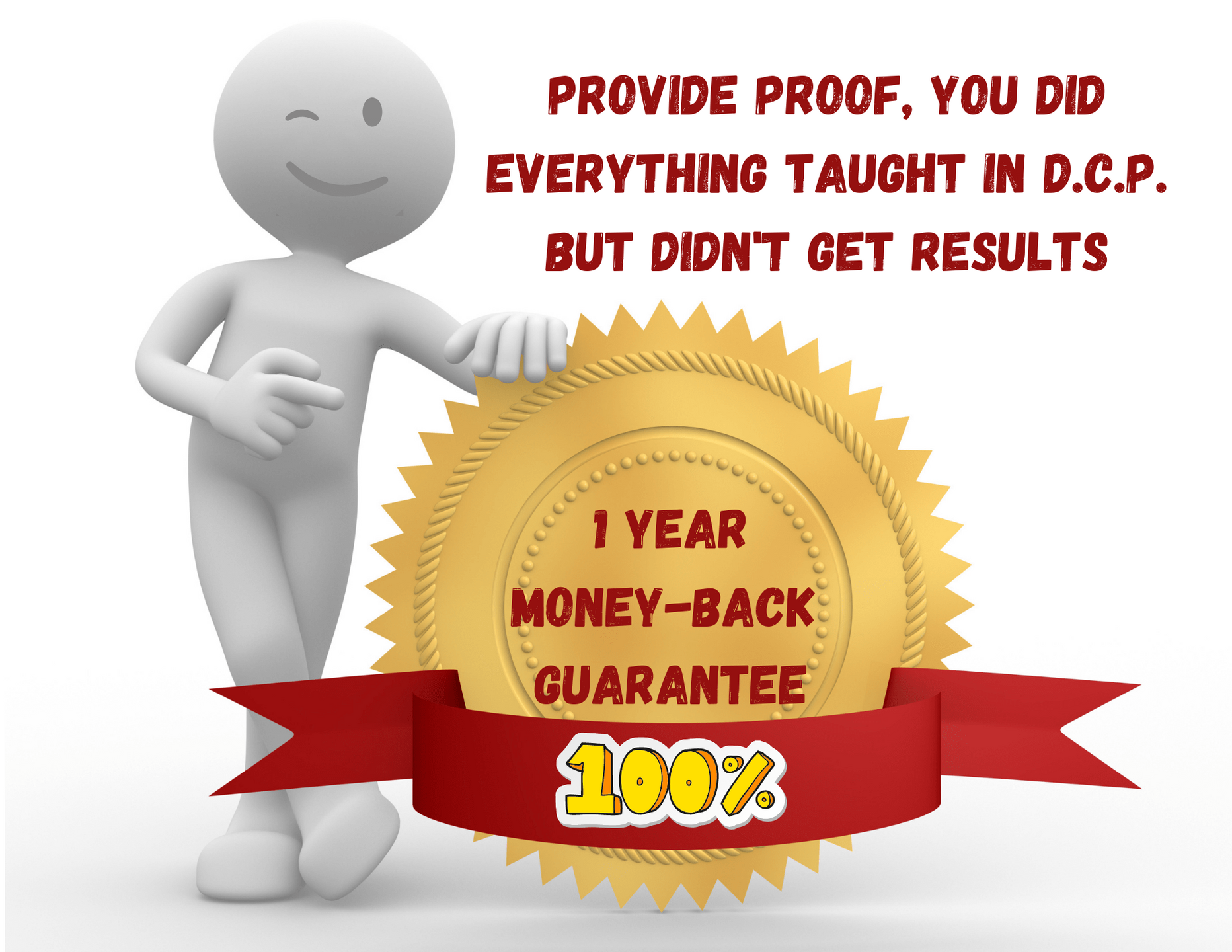 You can email [email protected] within 365 days with proof that you did everything taught in D.C.P. and didn't get results.